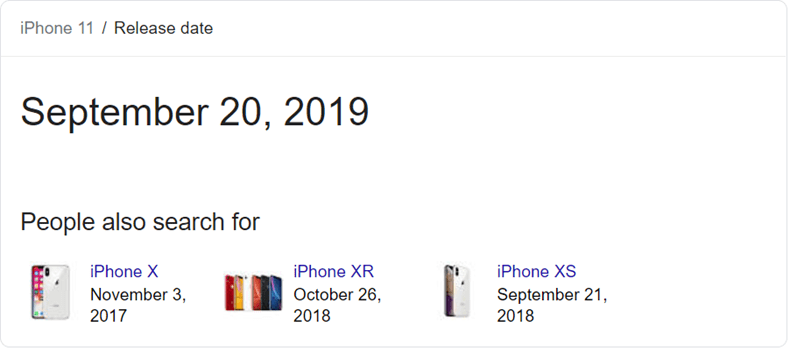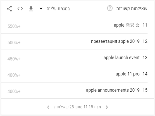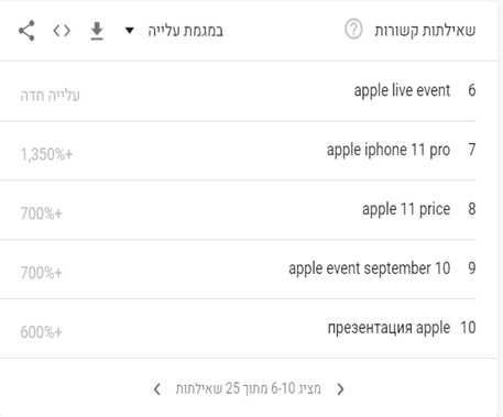 ההסבר לכך חבוי בהשקת אייפון 11 החדש ואירועי "אפל" הנלווים לו. ניתן לראות בחלקו התחתון של גוגל טרנדס את החיפושים הפופולריים ביותר בהתאם לתקופת ההשוואה. על כן, לפי השאילתות ניתן לראות בבירור את הסיבה לעליה החדה בפופולריות על פני המתחרים.