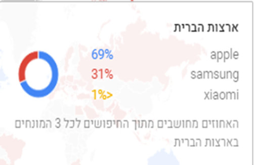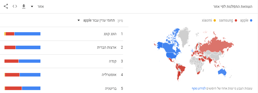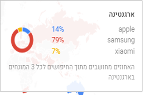 הארצות הנבחרות הן ארה"ב, ארגנטינה. הסיבה לבחירתן נובעת מהבדלי הצבעים (כחול/אדום) שהעידו על שוני מהותי מבחינת בין הפופולריות של Apple ו Samsung. החיפוש הוגדר לטווח 5 השנים האחרונות כדי לא לפגוע בנתוני Xiaomi עקב כניסתם המאוחרת לשוק (נספח ג').